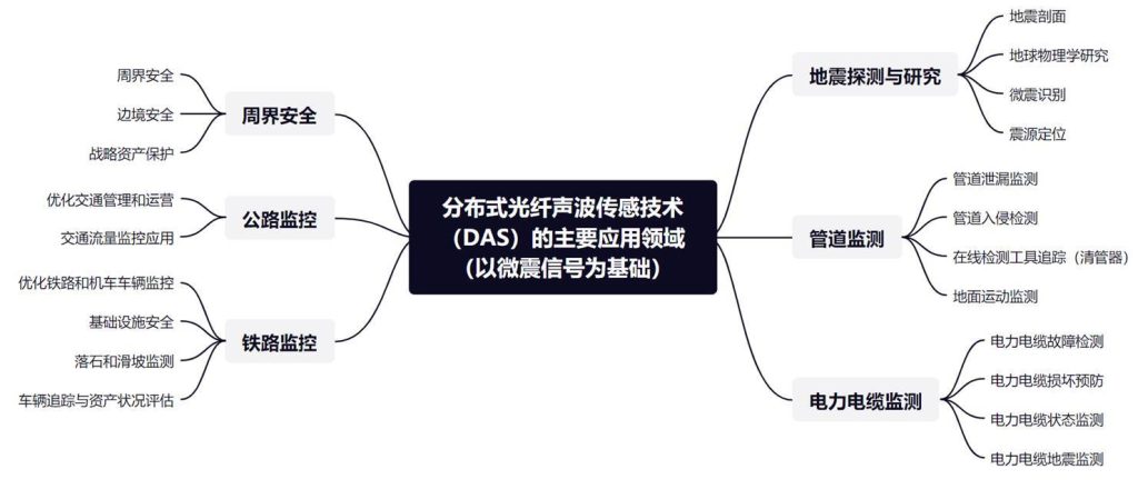 基于光纖的分布式聲波傳感器(DAS)是一種利用光纖中的后向瑞利散射(RBS)來定位和恢復(fù)光纖鏈路上的任意位置處機械振動信息(振幅、相位和頻率)的技術(shù) 。由于機械振動通常能夠在介質(zhì)中傳播很遠,DAS 能夠檢測遠離光纖的事件;基于光纖的低損耗特性,傳感光纖的長度可達數(shù)千米至上百千米,因此 DAS 系統(tǒng)的探測覆蓋范圍非常廣;DAS 的振動檢測帶寬可高達數(shù)十千赫茲,可以包含待測事件的豐富信息 ;傳感光纜具有本征安全、抗電磁干擾、耐惡劣環(huán)境等優(yōu)勢。這些優(yōu)點使得 DAS 在周界圍欄安防、管道安全監(jiān)測、井下資源勘探等長距離應(yīng)用領(lǐng)域中有著巨大的應(yīng)用潛力,并且其應(yīng)用領(lǐng)域仍在不斷拓展中。